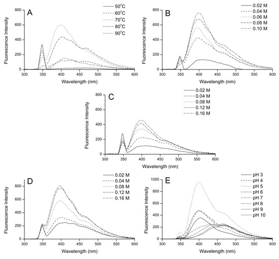 Effect of (A) temperature, (B) initial reactant concentration, (C) initial fructose concentration, (D) initial histidine concentration, and (E) initial pH value on the fluorescence spectrum of the fructose–histidine Maillard reaction model system heated for 5 days.