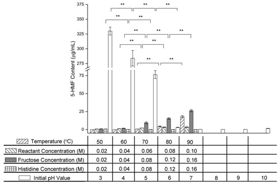 As the initial pH value was increased from 3.0 to 9.0, the 5-HMF content decreased from 329.938 ± 6.713 μg/mL to 1.596 ± 0.224 μg/mL, indicating that a high pH promoted 5-HMF consumption in the final stage of the Maillard reaction of fructose and histidine.