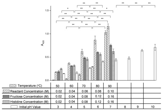 The A420 increased 3.86-fold as the initial pH value was increased from 3.0 to 10.0, which showed that a high pH value was beneficial for pigment formation in the final stage of the Maillard reaction of fructose and histidine. Similar results have been reported for the glucose–ammonium sulfate system, which showed a significant increase in A420 with increasing pH [34].
