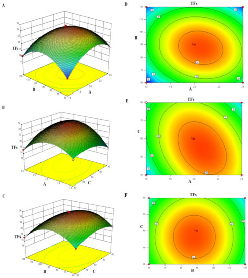 The response surface and contour plots represent the interaction between two factors. The steeper the response surface, the denser the contours, the more obvious the interaction of the two factors is. Conversely, the interaction between the two factors is not obvious [17]. From Figure 1A,B, it can be known that when the particle size (C) is fixed at a sieving mesh size of 60, the TFs content increased first with steam pressure and duration, and then slowly dropped after reaching a certain level. This showed that under suitable pressure and duration conditions, steam pressure fully entered the cells, damaging the cell walls, and hence releasing the total flavonoids. However, as the steam pressure (A) and duration (B) kept increasing, excessive high-temperature and high-pressure would degrade the total flavonoids, and the flavonoids dissolved out of the cells would reaggregate to form insoluble substances [18]. From Figure 1C,D, it can be known that when duration (B) is fixed at 90 s, the TFs content increased first with steam pressure (A) and particle size (C), and then slowly dropped when a certain level was reached. This was because under suitable steam pressure and particle size conditions, the surface area of SP was increased, hence facilitating high-pressure steam to fully enter the cells [18]. From Figure 1E,F, it can be known that the interaction between duration and particle size had a slight influence upon the change of TFs content.