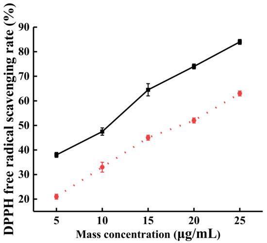 After steam explosion, the DPPH free radical scavenging effects of SP TFs was measured. As shown in Figure 3, within the concentration range of 5–25 μg/mL, the DPPH free radical scavenging effect of TFs after steam explosion improved from 38% to 84% (black solid line); while that of TFs from the original SP improved from 21% to 63% (red broken line).