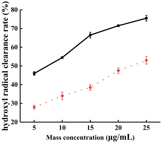 The ·OH free radical scavenging effects of TFs was measured after steam explosion. As shown in Figure 4, within the concentration range of 5–25 μg/mL, the ·OH free radical ability by TFs from SP after steam explosion was improved from 46% to 75.5% (solid line); while that of the original TFs improved from 28% to 53% (broken line). The results indicate that after steam explosion, with the increased content of TFsas, the free radical scavenging ability was also increased. Moreover, the ·OH scavenging activity IC50 was 4.32 μg/mL, a 78% decline compared with the IC50 (7.68 μg/mL) of the original TFs.