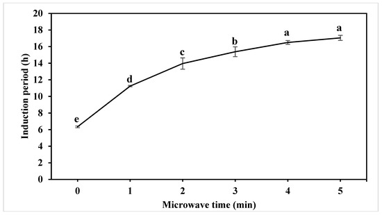 Effect of microwave pretreatment on the oxidative stability of oil. Different characters (a–e) on top of the line indicate significant (p < 0.05) differences among samples with different treatment times.