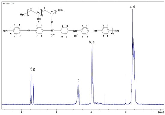 To obtain the molecular structure of PVA–PANI copolymers, 1H-NMR analysis (500 MHz, TMS) was carried out using deuterium oxide (D2O) as solvent. The obtained spectrum for PVA–PANI is shown in Figure 1 where at δ = 7.3 ppm and δ = 7.5 ppm there is evidence of a doublet of doublets (d, J = 6.5 Hz, C6H4) corresponding to the benzenoid and quinoid sections of PANI in emeraldine phase, then δ = 4.7 ppm (s, D2O). The doublet located at δ = 3.9 ppm (d, J = 28.5 Hz) corresponds to the characteristic signal of α proton of oxygen binding PVA–PANI, while the multiplet located at δ = 1.5 ppm (m, J = 18.7 Hz) suggests the integration of methylene protons from the PVA backbone [,].