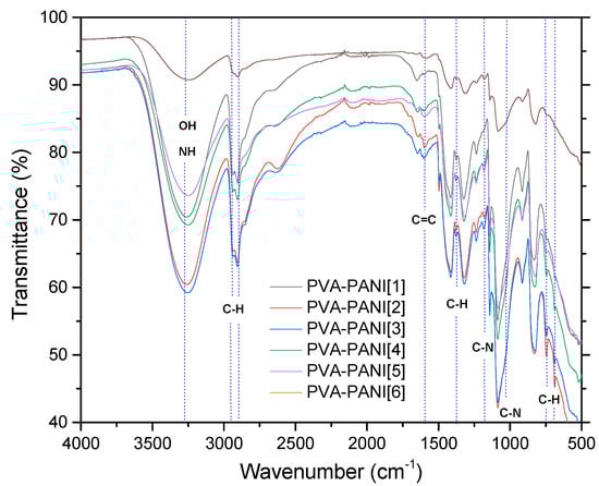 The implementation of dialysis has been used for the purification of PANI, since it provides a better dispersion of particles and minimizes product loss. However, filtration of the product obtained from precipitation–redispersion is highly recommended, since it takes a short time and allows the obtaining of only the desired copolymer in gel form through precipitation. Figure 4 shows the corresponding bands of PVA gels modified with PANI (ES) nanoparticles obtained by the precipitation–redispersion method with different concentrations of aniline (Table 1). An increase in the absorption bands with the increase of monomer in the PVA matrix was observed.