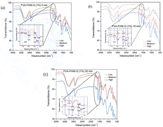 The absorption bands located between 3600 and 3000 cm−1, attributed to O–H and N–H groups of PVA and PANI, respectively, show an intensity increase which is due to the functional groups in this range and widening due to minimum wavenumber displacements. Subsequently, in the range of 2350 to 1750 cm−1, small absorption bands can be observed corresponding to the presence of overtones from PVA–PANI. These bands show an intensity decrease with increasing aniline in the polymer matrix. The latter can be attributed to chain length variation of the obtained PANI for each experiment. An increase in the absorption band located at 1586 cm−1 indicates an increase in C=C bonds associated to quinoid rings which can also be correlated to significant production of PANI in the PVA matrix. The absorption bands found at 1416, 1369, and 1320 cm−1 correspond to the absorption of C–C stretching of the quinoid ring in PANI, the flexion of the C–H group, and the stretching vibration of the C–N bond of the amine in the aromatic ring, respectively. Absorption bands due to the vibration of the C–N bond and the stretching of the C–H group from the aromatic ring within the plane are shown at 1230 and 1130 cm−1, respectively. The band located at 1090 cm−1 corresponds to the stretching vibration of the C–O bond which tends to be much higher in PVA–PANI composites, showing a more pronounced shoulder in 1031 cm−1 with the increase of monomer, demonstrating a cross-linking between the materials []. The FTIR spectra obtained for the activated material with 1% GA solution for an activation time of 5, 15, and 30 min can be observed in Figure 5a–c, respectively.