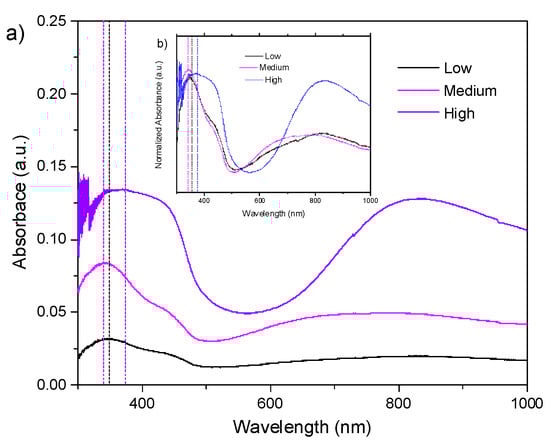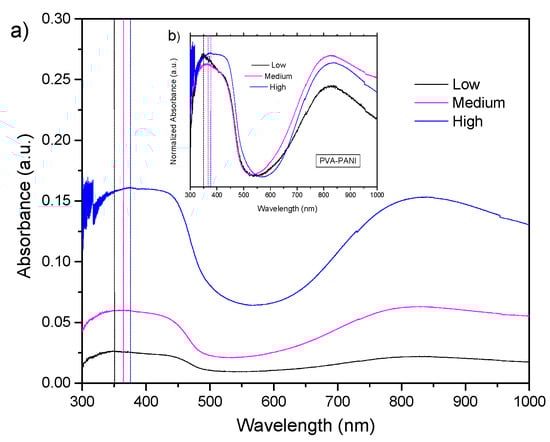 UV–Vis-NIR absorption spectra and its normalized form for PVA–PANI films at low, medium, and high concentrations of PANI can be observed in Figure 6. Absorption bands corresponding to – transitions from the excitation of benzenoid segments (~330 nm), polaron- transitions associated with benzenoid and quinoid ring (~430 nm), and -polaron transitions from the excitation of quinoid rings from doped PANI (~800 nm) can be seen in each experiment [,]. The absorption bands corresponding to – transitions show a bathochromic effect as a function of the increase in aniline concentration in the PVA matrix, attributed to an increase in the molecular weight of the produced PANI []. Furthermore, a clear hyperchromic effect is observed, associated to the increase in concentration of the material, as established by Beer–Lambert’s law.