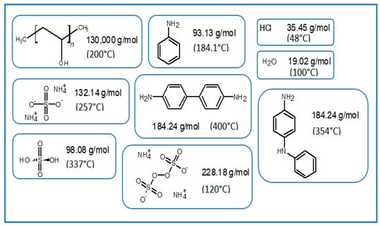 When carrying out the PVA–PANI synthesis by the polymerization dispersion method, a number of byproducts related to doping, oxidant material (APS) and oligomers are generated (Figure 8). Therefore, these byproducts must be eliminated by means of a purification process, in order to obtain the PVA–PANI material without any other product that influences the effects produced by the material in future characterizations.