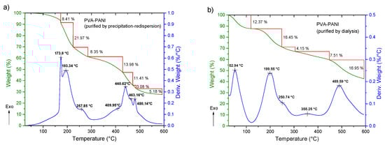 TGA-DTG of PVA–PANI purified by (a) precipitation–redispersion and (b) dialysis.