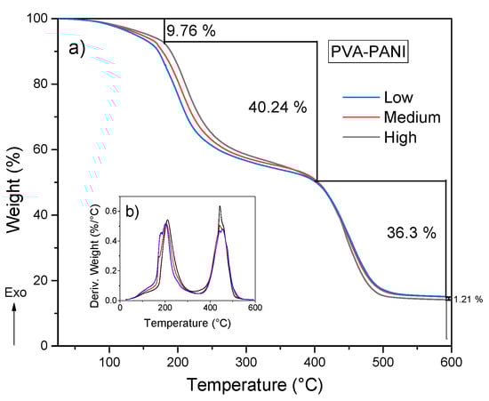 (a) TGA and (b) DTG of purified PVA–PANI gels at low, medium, and high concentrations of PANI.