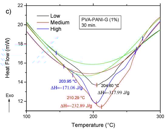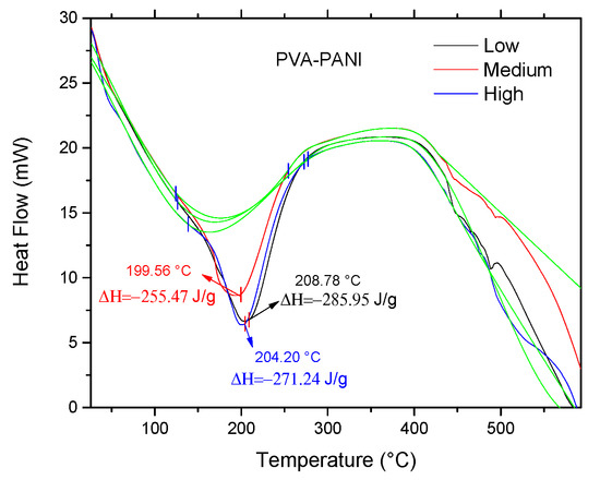 Correlation of previously obtained thermal stability and cross-linking was studied by DSC, in order to observe energy variations associated to interactions of the polymer matrix with the PANI nanoparticles. According to the obtained DSC results (Figure 12), the presence of an endothermic peak at ~200 °C can be attributed to a cross-linking reaction between PVA and PANI at that temperature, where enthalpy changes are inversely proportional to the concentration of chemically linked PANI []; indicating that PVA–PANI at low concentration of monomer shows a better cross-linking between the materials. Also, it can be seen that no other prominent transition peaks are shown in the thermogram, indicating that the purified material is amorphous.