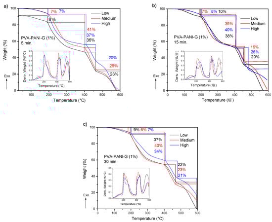 TGA and DTG thermograms of purified PVA–PANI-G gels, activated with 1% GA for (a) 5 min, (b) 15 min, and (c) 30 min.