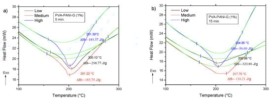 The DSC analysis for the previous gels is shown in Figure 14. Comparing the thermogram from Figure 12 to the obtained results for the activated copolymers, it is seen that a decrease in transition temperatures is obtained for low aniline concentration along with a decrease in enthalpy from −285.95 J/g to a minimum of −320.86 J/g at 15 min of activation, which indicates that cross-linking is favored with an increase of GA for this particular concentration. However, with an increase in activation time, the material shows an increase of enthalpy up to a maximum of −56.69 J/g for a high concentration of PANI at 30 min of activation, meaning that cross-linking between PVA–PANI and GA is disfavored, which can be related to a molecular disarrangement produced by branching of PVA–PANI, making it difficult to cross-link. Results for a higher concentration of GA are provided in Figure S3.
