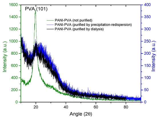 Even though a significant difference in morphology is shown between both purification methods, we found no significant difference in the crystallinity of the material according to Figure 15, where PVA–PANI purified by dialysis tends to show a better molecular order due to the stabilizing effect of the PVA, promoting better control in the growth of nucleation sites for the obtained films.