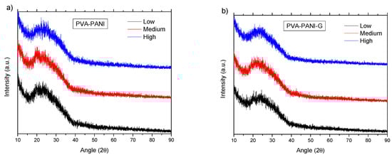 From the data shown in Figure 16a, it can be observed that the purified PVA–PANI doped with HCl 1 M (pH = 1) has a low atomic order regardless of aniline concentration, showing a broad peak with a maximum intensity found at 2θ = 23.29°, which is in agreement with the reported for PANI doped with HCl [,]. It is expected to have a lower crystallinity of the copolymer with GA activation due to the disarrangement produced by cross-linking, increasing molecular dispersion, and broadening of the XRD peaks []. This behavior can be observed for PVA–PANI-G thin films at low, medium, and high concentrations of aniline (Figure 16b).