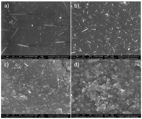 SEM micrographs of purified PVA–PANI thin films and its morphologic variations at (a) low concentration, (b) medium concentration, and (c,d) high concentration.