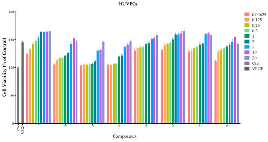 The endothelial cell’s proliferation is an important phase in the process of normal life. Human umbilical vein endothelial cells (HUVECs) are frequently used to measure the angiogenic property in vitro. HUVECs are usually used as a laboratory model system for the study of the function and pathology of endothelial cells such as angiogenesis [16] and hypertension [17]. Like human umbilical artery endothelial cells, they exhibit a cobblestone phenotype when lining vessel walls. To evaluate the cellular bioactivity in vitro, compounds 1–8 were studied on the HUVECs with different concentrations: 0.0625 μM, 0.125 μM, 0.25 μM, 0.5 μM, 1 μM, 2 μM, 5 μM, 10 μM, and 50 μM. A quantity of 20 ng/mL VEGF was used as a positive control. The results are shown in Figure 3 and Table 1.