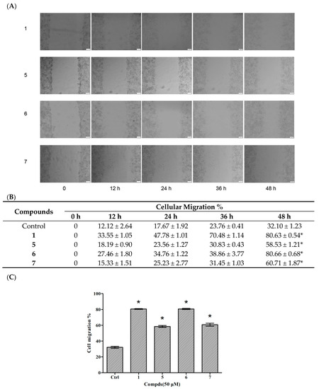 Effects of compounds 1 and 5–7 on HUVEC migration. (A) Observation of the effect of compounds on HUVEC migration; (B) The values of the compound-induced HUVEC migration at 0–48 h post-wounding; (C) Quantitative evaluation of the migration of HUVECs. Cellular migration was assessed at 48 h post-wounding. Data are expressed as the mean ± SEM (n = 4) of three individual experiments. Values vs control group: * p < 0.01 versus control.