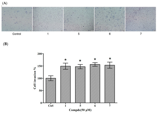 Effects of compounds 1 and 5–7 on HUVEC invasion. (A) Observation of the effect of compounds on HUVEC invasion; (B) Quantitative evaluation of the compound-induced HUVEC invasion. Cellular invasion was assessed at 24 h. Data are expressed as the mean ± SEM (n = 3) of three individual experiments. Values vs control group: * p < 0.01 versus control.