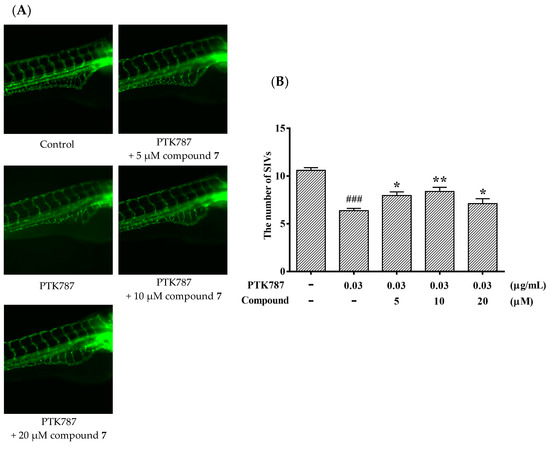 PTK787 is frequently used as angiogenesis inhibitors [18]. In order to test the effect of compound 7 on damaged zebrafish, we evaluated a quantitative assay in transgenic zebrafish using angiogenesis inhibitor PTK787. The 24 hpf embryos were cultured and collected. The inhibitor, PTK787 (0.03 μg/mL) was added into embryo water and the embryo were cultured 24 h. Subsequently, compound 7 was added into embryo water afer removing the PTK787 and cultured for 24 h. After 72 hpf, the embryos were anesthetized using 0.05% 2-phenoxyethanol in embryo water, and each embryo was examined for the presence of ectopic vessels in the subintestinal vessel plexus (SIV).