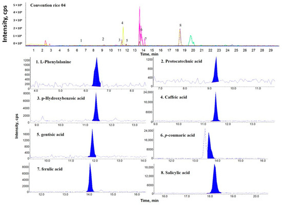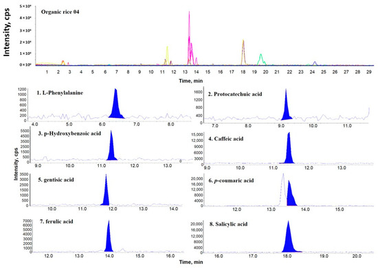 Representative multiple reaction monitoring (MRM) ion chromatogram of organic rice (OR)-04 and the corresponding extracted ion chromatograms of the detected phenolic compounds.