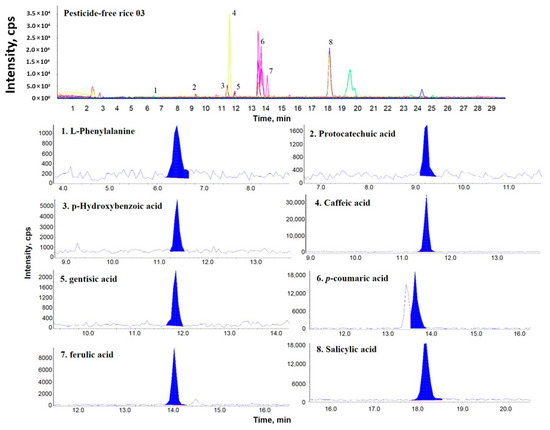 Representative MRM ion chromatogram of pesticide-free rice (PFR)-03 and the corresponding extracted ion chromatograms of the detected phenolic compounds.