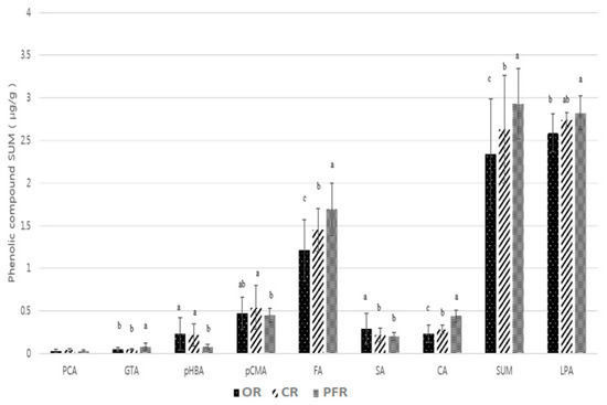 Distribution of phenolic compounds in OR, CR, and PFR. Letters a–c indicate a significant difference among the three groups (p < 0.05). Abbreviations: PCA (protocatechuic acid), GTA (gentisic acid), pHBA (p-hydroxybenzoic acid), pCMA (p-coumaric acid), FA (ferulic acid), SA (salicylic acid), CA (caffeic acid), LPA (l-phenylalanine), and ND (not detected).