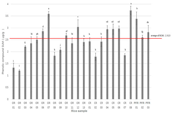 Figure 5 shows a comparison of the quantities of the different phenolic compounds detected in the various samples of rice. Following the calculation of the average distribution sum of the phenolic compounds (i.e., 2.51 μg/g), it was apparent that a number of samples exceeded this average, namely, OR-06, -07, -10, and -12; CR-04, -05, -06, and -08; and PFR-01, -02, and -03. In addition, CR-08 showed the highest distribution sum of phenolic compounds, and was also the sample that contained the highest p-coumaric acid content.