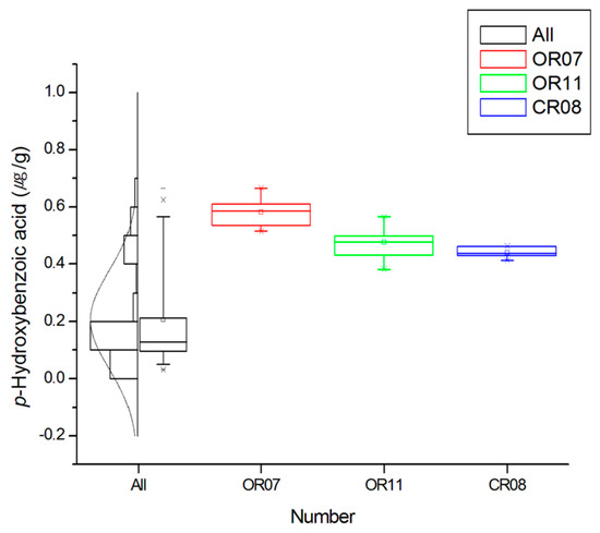 In contrast, OR-02 contained the lowest quantity of phenolic compounds, in addition to the lowest salicylic, ferulic, protocatechuic, gentisic, and p-hydroxybenzoic acid contents. In addition, the average detected contents of eight phenolic compounds was found to decrease in the following order: ferulic > p-coumaric > caffeic > salicylic > p-hydroxybenzoic > gentisic > protocatechuic acids. In the case of protocatechuic and gentisic acids, low contents and low LOD values were common, while for p-hydroxybenzoic acid (Figure 6), higher values were apparent in a number of samples, namely, OR-07 (0.58 μg/g), OR-11 (0.48 μg/g), and CR-08 (0.44 μg/g).
