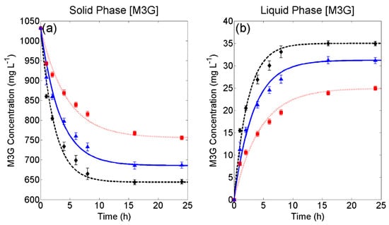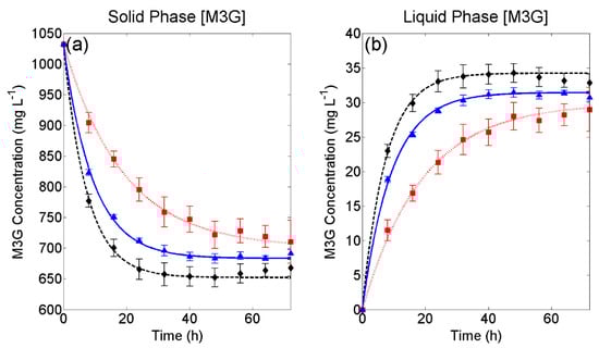 Figure 1 presents the experimental extraction curves of M3G from the grape solids (Figure 1a) and accumulation of M3G in the liquid phase (Figure 1b) at these varying conditions as well as the fit of Equations (14) and (15) of the forced convection model developed in Section 3.2 to the curves. Small error bars can be observed for each set of liquid phase conditions in Figure 1 (% RSD < 5.32, after the first hour of extraction), showing the high level of reproducibility among replicates. The root mean square error (RMSE) and R2 values were also calculated for each set of liquid phase conditions and in all cases, small RMSE (<1.58) and R2 values > 0.97 were observed (Table 1), indicating good agreement between experimental and mathematically-derived M3G concentrations. From Figure 1, it can be clearly observed that both the overall extraction rate (which in this case, can be approximated by the internal mass transfer rate) and maximum extractability of M3G are improved under conditions that emulate the later stages of fermentation (i.e., when more ethanol is produced). This is in agreement with other studies seeking to understand the influence of ethanol on phenolic extraction [8,10,11] and can be explained by the solvent properties of ethanol improving the solutions’ relative permittivity (the dielectric constant) [3], which may improve the rate of internal diffusion and extractability by aiding in the dissolution of M3G and in overcoming the liquids’ ability to penetrate the solid phase.