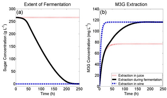 Figure 3a presents a typical red wine fermentation curve at 20 °C (black curve), solved using the fourth order Runge-Kutta method in MATLAB according to the method outlined in Section 3.4 and using the following set of initial conditions: = 20 °C = 0.05 h−1, = 0.0001 h−1, = 0.05 gEtOH gbiomass h−1, = = 0.05 g L−1, = 0.08 g L−1, = 0 g L−1, = 266 g L−1. Evidently, M3G extraction is initially limited by the fermentation lag-phase, where the liquid phase contains a high concentration of sugar and no ethanol. Although experimental extractions of M3G under fixed liquid phase and natural convective conditions reached a maximum liquid phase concentration within 72 h (Figure 2b), the simulated extraction curve presented in Figure 3b supported literature observations of extraction during active fermentation, where the time taken to reach a maximum anthocyanin concentration was seen to be considerably longer (up to a week) than extraction under fixed solvent conditions [4,5,20]. Figure 3b highlights the importance of ethanol in maximising extracted anthocyanins and implies that pre-fermentative maceration techniques, such as cold-soaking, in the absence of ethanol would not be expected to improve the concentration of M3G at the end of fermentation.