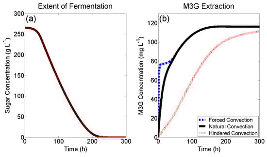 Figure 4a shows overlapping fermentation curves for the three simulated M3G extractions in Figure 4b. This is because the same initial conditions were used to solve for the fermentation model (described in Section 3.4), which does not consider liquid phase mass transfer as a fermentation parameter. In Figure 4b, ‘Forced Convection’ was modelled using an external mass transfer coefficient of 1 × 10−4 (Biot number > 1000), ‘Natural Convection’ was modelled using a varying external mass transfer coefficient according to Equation (4), and ‘Hindered Convection’ was modelled using a fixed system Biot number of 0.01 to show the effect of further limiting the rate of external mass transfer.