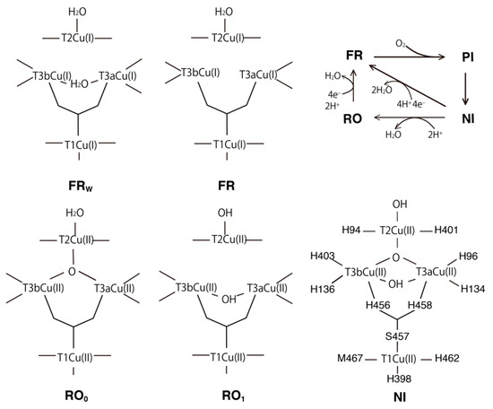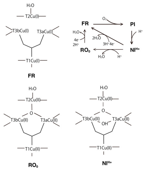 Schematic illustration of the proposed TNC intermediate states of BOD in the entire catalytic cycle. The calculated states were the native intermediate (NI), resting oxidized state in two different protonation states (RO0 and RO1), and fully reduced states with and without a bridging water molecule (FRW and FR).