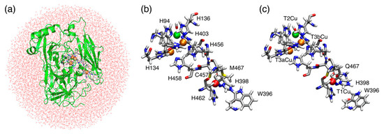 (a) Overall view of the QM/MM system used in the present study. (b) QM region in the wild-type (WT). (c) QM region in the M467Q mutant. The green, orange and red spheres represent the T2Cu, T3Cu and T1Cu atoms, respectively.
