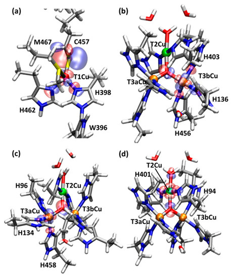 The T1Cu is coordinated by four amino acid residues, His398, Cys457, His462, and Met467. In the oxidized state such as RO0, the QM/MM optimized T1Cu(II)-S(Met467) distance is R(T1Cu(II), S(Met467)) = 3.23 Å, which is longer compared to the other coordination distances; R(T1Cu(II), N(His398)) = 2.01 Å, R(T1Cu(II), N(His462)) = 1.98 Å, and R(T1Cu(II), S(Cys457)) = 2.17 Å. The coordination geometry of T1Cu is trigonal–pyramidal, where the atoms in the two His and Cys residues form an equatorial triangle and the S atom in Met467 defines the axial coordination. As shown in Figure 3a, the localized singly occupied natural orbital (LSONO) [17] for the T1Cu is composed of the Cu dx2-y2 orbital and 2p orbital of the Cys457 S atom. The calculated Löwdin atomic spin densities (ρ(S(Cys457)) = 0.53 and ρ(T1Cu) = 0.34) also show a large spin/unpaired electron orbital distribution over the T1Cu and S of Cys457 (Table 1).