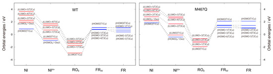 The corresponding orbital energies of the M467Q mutant are all increased. For example, in RO0, the βLUMO for T1Cu and the average for the TNC higher βLUMOs are −1.927 eV and −1.003 eV, which are increased by 1.053 eV and 0.422 eV, respectively. In FRW, the βHOMO for T1Cu and the average for the TNC lower βHOMOs are 2.099 eV and 1.340 eV, which are increased by 1.378 eV and 0.383 eV, respectively. Therefore, a consequence of the mutation is the increase of the T1Cu as well as the TNC orbital energies. The upshift of the T1Cu orbital energy level in the M467Q mutant is consistent with the decrease in the T1Cu redox potential from 470 mV to 270 mV in the M467Q mutant [12], which contributes to slowing down the electron transfer from bilirubin to T1Cu. It should be noted again that the lower shift of the T1Cu orbital is not permitted because it must be higher than the orbital levels of TNC. In this sense, the redox potential of T1Cu is optimized in the WT BOD to catalyze the bilirubin oxidation.