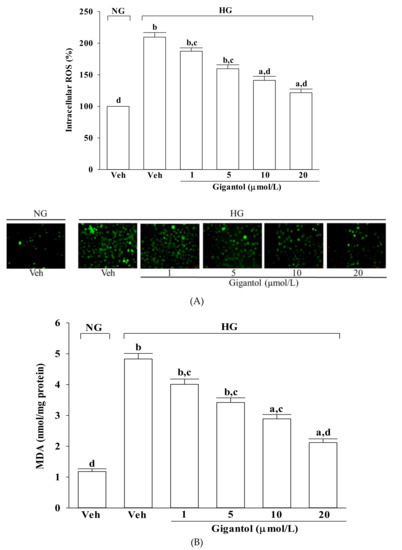The intracellular levels of ROS and MDA in MES-13 cells were higher by about 2.2-, and 4.8-fold, respectively, in high glucose cultured cells when compared to the normal-glucose vehicle-treated group (Figure 2A,B). The higher levels of ROS and MDA in MES-13 cells under high glucose were reduced by gigantol (20 μmol/L) treatment with a decrease of 45.8 and 56.1%, respectively, relative to those observed in the vehicle-treated counterparts (Figure 2A,B).