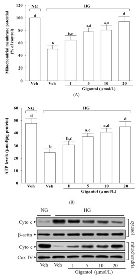 Effects of gigantol on high glucose-induced mitochondrial dysfunction in MES-13 cells. Cells were pretreated with different concentrations of gigantol (1, 5, 10 or 20 μmol/L) for 1 h and then exposed to normal (NG) or high (HG) glucose for an additional 48 h. (A): Mitochondrial membrane potential was assessed using JC-1 dye. (B): ATP production was measured by luciferin-luciferase assay. (C): The photographs were representatives the western blots for the expression of cytochrome c (Cyto c) in the cytosolic and mitochondrial fractions. (D): The apoptosis index was measured by detection of DNA fragmentation with the cell death detection ELISA kit. The experiments were performed in triplicate and data are presented as the mean ± SD of five independent experiments (n = 5). a p < 0.05 and b p < 0.01 when compared to the normal glucose vehicle (Veh)-treated control group. c p < 0.05 and d p < 0.01 when compared to the high glucose vehicle-treated group.