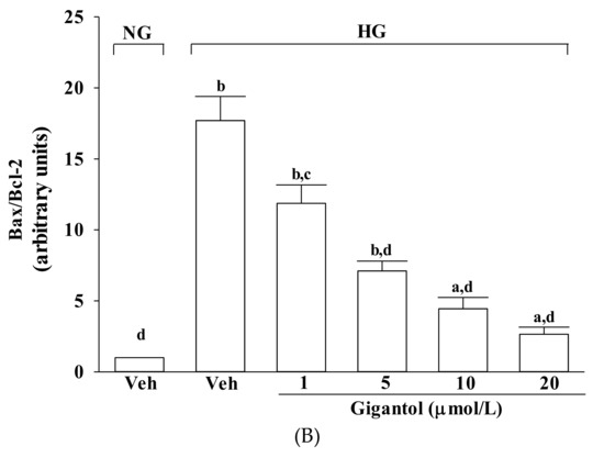 High glucose greatly increased the Bax/Bcl-2 ratio in MES-13 cells (by 17.7-fold relative to that seen in the normal-glucose vehicle-treated group; Figure 4B). This high glucose-induced up-regulation in the Bax/Bcl-2 ratio was reversed in the MES-13 cells after treatment with 20 μmol/L gigantol, with a 85.1% decrease when compared to that of their vehicle-treated counterpart group (Figure 4B).