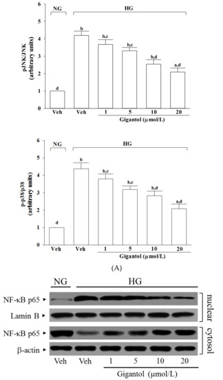 The nuclear-to-cytosolic protein expression ratio of NF-κB p65 protein was 12.3-fold higher in the high glucose cultured MES-13 cells compared to that in the normal glucose vehicle-treated group (Figure 5B). Gigantol (20 μmol/L) suppressed the nuclear-to-cytosolic protein expression ratio of NF-κB p65 protein in the high glucose cultured MES-13 cells by 17.5% relative to that seen in their vehicle-treated counterpart group (Figure 5B).