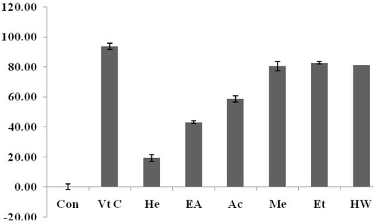 DPPH scavenging activity of solvent extracts of C.yabunikkei leaf (extract cont: 0.5 mg/mL, Ascorbic acid: 20 μg/mL). The asterisk represents a value significantly different from the other groups (p < 0.05). Values were the mean ± standard deviation (n = 3) Vt C; ascorbic acid, He; hexane ex, EA; ethylacetate ez, Ac; acetone ex, Me; methanol ex, Et; ethanol ex, HW; hot water ex.