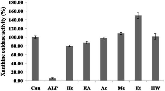 Xanthine oxidase inhibitory activities in various solvent extracts of C.yabunikkei leaves (1 mg/mL) and allopurinol (ALP, 50 μg/mL). ALP; allopurinol, He; hexane, EA; ethylacetate, Ac; acetone, Me; methanol, Et; ethanol, HW; hot water extract. Values were the mean ± standard deviation (n = 3).