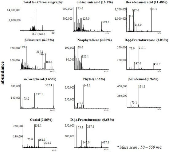 GC-MS analyses were performed to identify the active constituents from C.yabunikkei leaf with antioxidant, xanthine oxidase inhibitory and elastase inhibitory activities. Typical GC-MS chromatograms of phytochemical contents and their retention times are shown in Table 2. Eight compounds [i.e., α-Linolenic acid (16.1%), Hexadecanoic acid (11.48%), Neophytadiene (2.05%), d-(−)-Fructofuranose (2.03%), α-Tocopherol (1.65%), Phytol (1.36%), β-Eudesmol (0.94%), Guaiol (0.86%), and d-(−)-Fructofuranose (0.68%)] were mainly identified by GC-MS analysis (Figure 4). As shown in Table 2, several components associated with antioxidant efficacy and xanthine oxidase inhibition were referenced. α-Linolenic acid and α-Tocopherol were typical substances with both antioxidant effect and xanthine oxidase inhibition. In Table 2, it is considered that the activity of hexane extract is due to the synergistic effect of various substances since a number of active substances are involved in the process of antioxidant and xanthine oxidase inhibition.