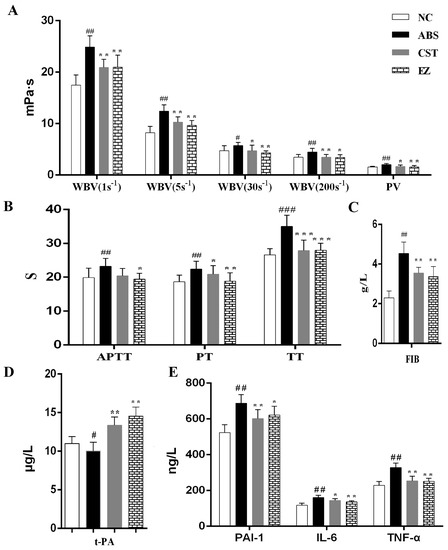The influence of EZ on the related functions in normal control (NC), acute blood stasis (ABS), compound salvia tablets (CST), and EZ groups. Note: Whole blood viscosity, including 1 s−1, 5 s−1, 30 s−1, 200 s−1 shear rates, and plasma viscosity (A); four blood coagulation indexes, including PT, APTT, TT, and FIB (B,C); fibrinolytic factors and inflammatory factors (D,E); compared with NC group, ###, ## and # represent p < 0.001, p < 0.01 and p < 0.05, respectively; compared with ABS group, ***, ** and * represent p < 0.001, p < 0.01 and p < 0.05, respectively.