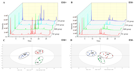 UPLC-Q/TOF-MS total ion chromatograms (TIC) of plasma samples among NC, ABS, CST, and EZ groups in ESI+ mode (A) and ESI− mode (B); PCA score plots of plasma metabolic profiling of NC, ABS, and EZ in ESI+ mode (C) and ESI− mode (D).