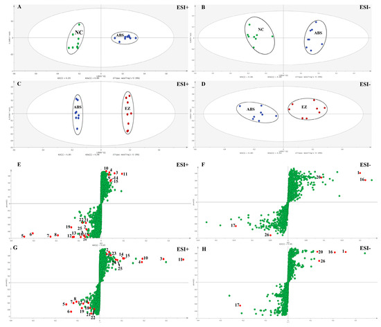 OPLS-DA model results of plasma metabolic profiling of NC/ABS and ABS/EZ in ESI+ mode (A,C) and ESI− mode (B,D); OPLS-DA s-plots of plasma metabolic profiling of NC/ABS and ABS/EZ in ESI+ mode (E,G) and ESI− mode (F,H). Note: The numbered red dots represent 26 potential biomarkers respectively, which are shown in Table 2.