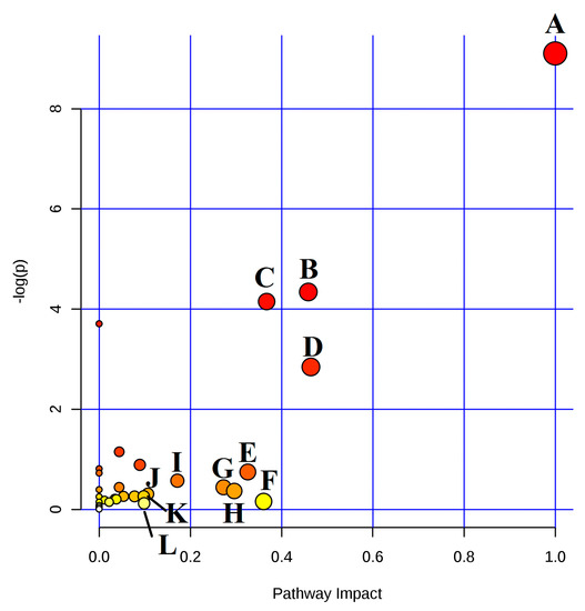 Summary of pathway analysis with MetPA. (A) Linoleic acid metabolism; (B) sphingolipid metabolism; (C) glycerophospholipid metabolism; (D) ether lipid metabolism; (E) arachidonic acid metabolism; (F) glutathione metabolism; (G) pentose and glucuronate interconversions; (H) glyoxylate and dicarboxylate metabolism; (I) tryptophan metabolism; (J) glycerolipid metabolism; (K) lysine degradation; (L) steroid hormone biosynthesis.