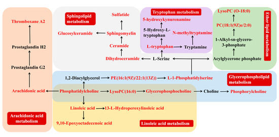 Metabolic pathway analysis results showed that blood stasis was mainly related to lipid metabolism and amino acid metabolism, which were in accordance with the previous reports [41,42]. Metabolic pathways associated with lipid metabolism, including linoleic acid metabolism, ether lipid metabolism, sphingolipid metabolism, glycerophospholipid metabolism, and arachidonic acid metabolism. LysoPCs were resulted from partial hydrolysis of phosphatidylcholines, which removes one of the fatty acid groups. The hydrolysis is generally the result of the enzymatic action of phospholipase A2. LysoPCs were important metabolites in lipid metabolism, which also play an important part in the development of many diseases, including atherosclerosis, diabetes, cancer, inflammation, and blood lipid disorders [43,44]. In the progress of coagulation, LysoPC can restrain the transcriptional activity of tissue factors and NF-κB by disrupting the binding site of κB, thereby raising cAMP levels of monocytes to regulate the expression of tissue factors that take part in thrombosis [45]. Compared with the NC group, LysoPCs, including LysoPC (16:0), PC (18:1(9Z)e/2:0), LysoPC (O-18:0), PE (16:1(9Z)/22:1(13Z), Phosphorylcholine, PE (P-16:0e/16:0), and PC (16:1(9Z)/18:1(9Z)) in the ABS group were all significantly declined in the ABS group and increased in the EZ group, indicating that glycerophospholipid metabolism plays an important role in the formation and cure of blood stasis syndrome.