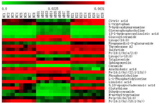 In addition, we also discovered that amino acid metabolism was obviously disturbed by acute blood stasis. Kynurenine is an important producer of l-tryptophan due to its immune-suppressive action. Evidence proved that kynurenine could accelerate activated Th cells apoptosis, induce immunosuppressive Treg cells differentiation, and restrain immunoreactions [50,51]. In this study, l-tryptophan was reversed from the ABS group to the EZ group. Except the above metabolic pathways, metabolites in glutathione metabolism, glyoxylate and dicarboxylate metabolism, pentose and glucuronate interconversions, steroid hormone biosynthesis, and lysine degradation were also recovered to the level of the NC group.