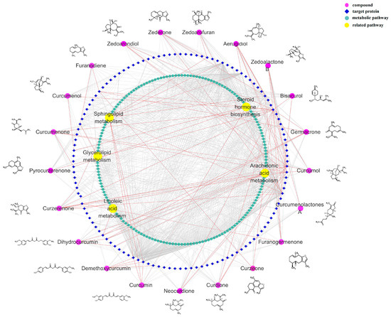 The component-target-pathway network results are shown in Figure 7. The network predicted that 124 targets were closely related to 21 chemical components, in which 68 targets were closely related to blood stasis. It also predicted that 616 metabolic pathways were related to 68 targets, in which five metabolic pathways, including linoleic acid metabolism, arachidonic acid metabolism, glycerolipid metabolism, sphingolipid metabolism, and steroid hormone biosynthesis, corresponded with plasma metabolomics results.